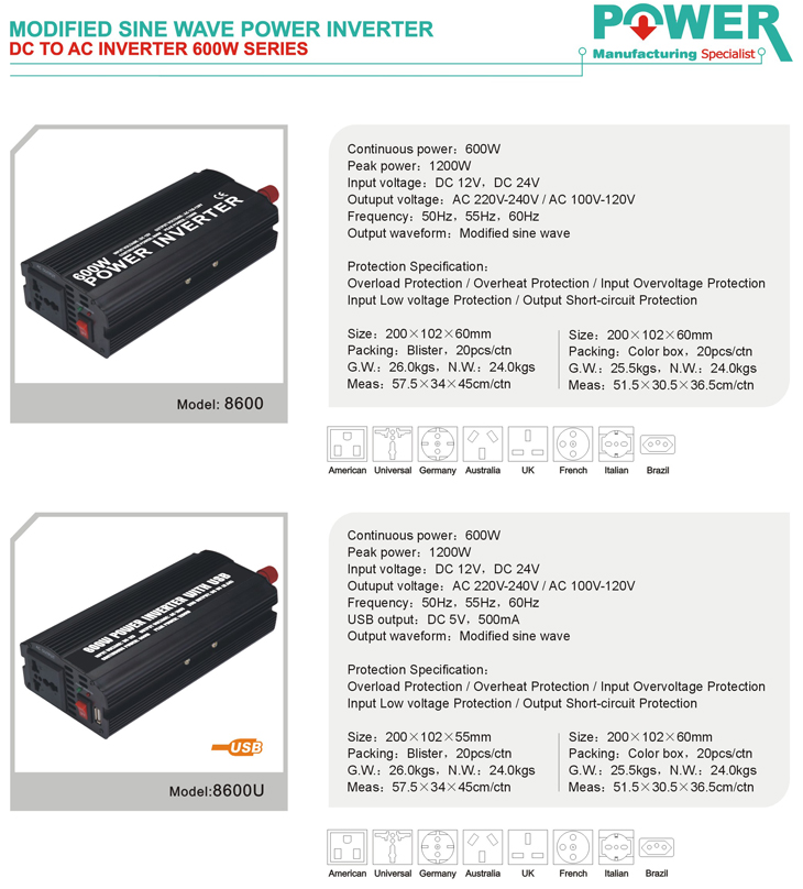 | 8600 OR 8600U(USB) - CLASS:DC TO AC INVERTER 500W 600W |
